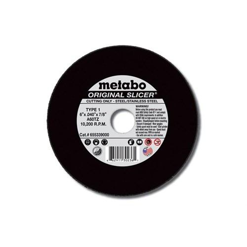 The Metabo Original Slicer is a high-performance aluminum oxide wheel designed for heavier working conditions on steel and other ferrous metals. With a 4-1/2-inch diameter, 3/32-inch thickness, and 5/8"-11 threaded hole, it offers a very fast rate of cut, good wheel life, and flexibility for flush cutting applications.