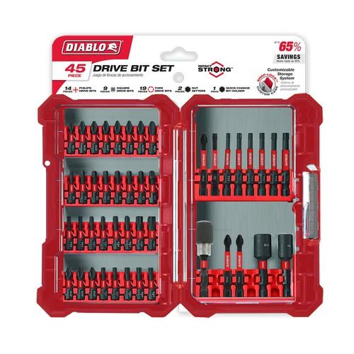 Diablo's hi-performance screw driving set delivers extreme durability and longer life in the installation and removal of fasteners. The included drive bits have an optimized tip design to provide a strong, precise grip that reduces wear, stripping and slippage. The magnetic nut setters and drive bit holder are designed with a high-strength, permanent magnet for a secure, anti-wobble grip when fastening screws and nuts. Torque Resistant Design absorbs torque for less stress at the tip. This set is Impact Strong™, delivering increased shank stability and durability in cordless and corded impact and drill drivers.