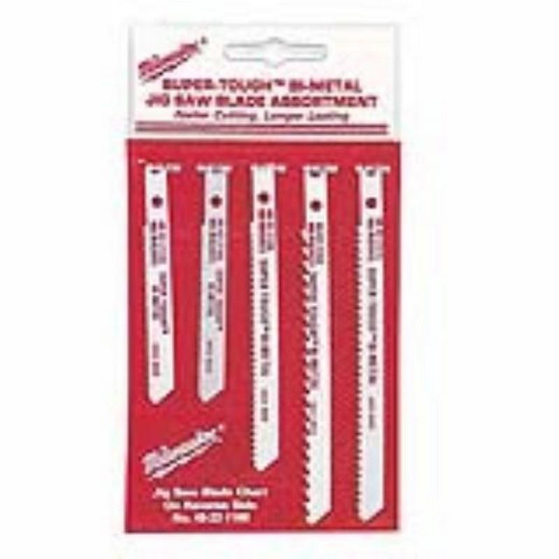 This kit contains the most popular Jig Saw Blades with a 1/4 inch universal tang. These blades fit Milwaukee Jig Saw model 6256-6 and other popular Jig Saws with this tang configuration. Assortment includes one each -2120 for metal over 1/8 inch, -2160 for metal under 1/8 inch, -2190 for metal over 1/4 inch, -2300 for nail embedded wood, and -2310 for nail embedded wood.