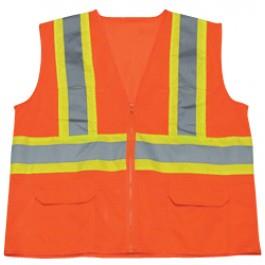Orange mesh with 4” lime striping with 2" silver reflective vertical stripes on back, zipper closure with radio clips
