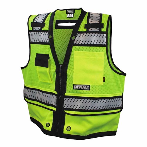 The DEWALT DSV521 Class 2 heavy duty surveyor vest will help protect workers with a brand name they know and trust. The DSV521 is built with durable stitch reinforcement at major stress points and heavy webbing to provide Guaranteed Tough™ protection. The segmented heat transfer silver reflective tape with contrasting trim will help provide extra visibility in low light conditions. This surveyor vest includes multiple, tough woven twill fabric pockets, including a large back "plan" pocket