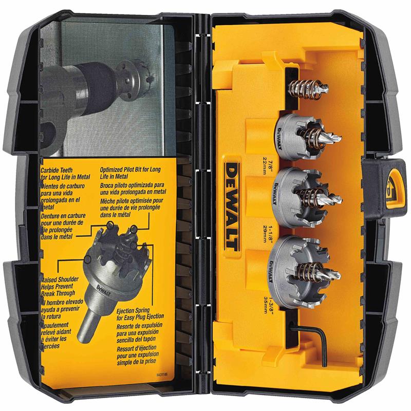 Equipped with heavy-duty carbide teeth for long life and ejection springs for easy plug removal, the DEWALT [Tool or Family Name] features 3 hole saws for a range of metal-cutting applications. A raised shoulder helps helps to prevent breakthroughs. An optimized tooth design delivers fast drilling speeds for helps to increased efficiency.