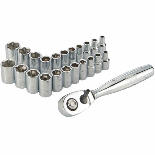 The 23 Piece 1/4" Drive Socket Set has knurled beauty rings providing a non-slip gripping surface. The product is easy to use with one hand and its low profile directional lever helps to reduce catch points. The set comes in a compact molded case perfect for any shop or garage.