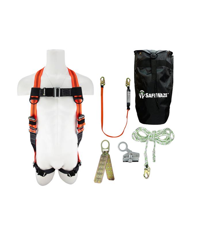The SafeWaze V-Line FS120-E-1118DC-BP Kit includes a pass through leg harness, single leg lanyard, rope lifeline, dual cam rope grab and reusable roof anchor packaged in a convenient heavy duty carry bag.