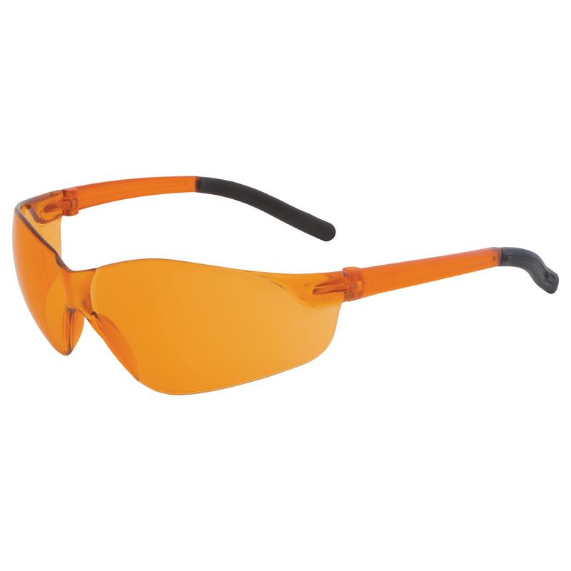 Frameless wraparound, 9.5 base curve, safety glass provides optical protection. 4-position adjustable length temples have non-slip rubber tips. Integrated nose pads. Stainless steel hinge screws. Lenses offer 99% UV protection. Meets ANSI Z87.1 - Impact.