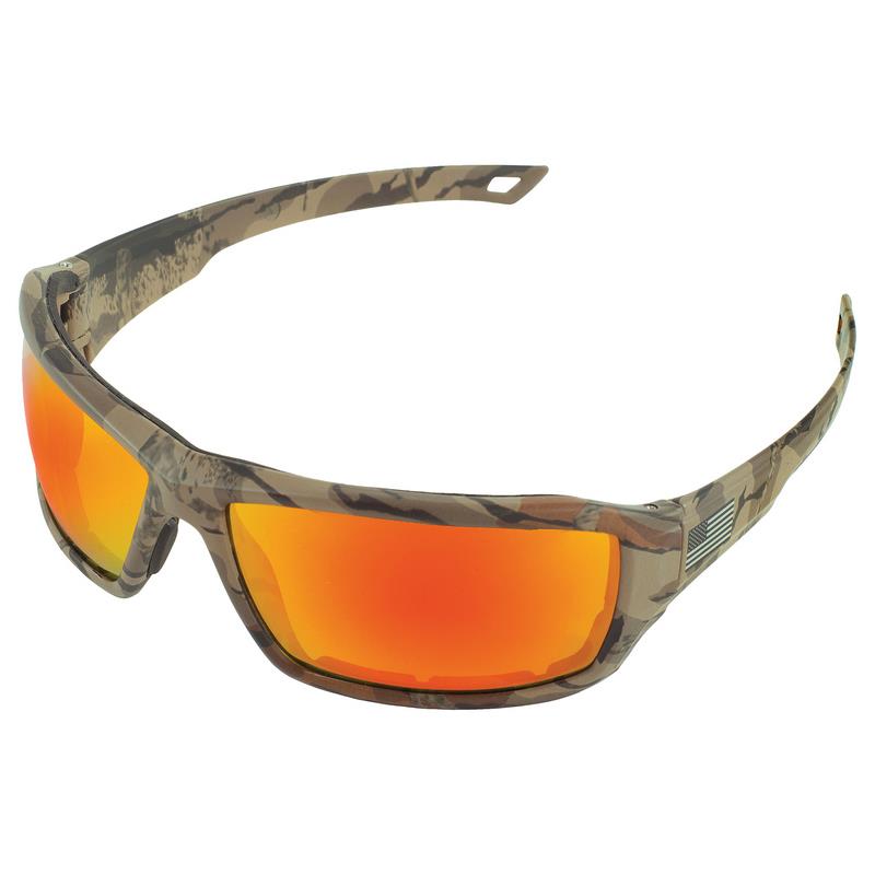 Camo patterned full frame safety glasses with hard coated polycarbonate lenses. American flag printed on left temple. Permanently affixed cushioned brow pad on interior of glasses. Polycarbonate lenses provide 99% UV protection. Meets the requirements of ANSI Z87.1 - Impact. Retail Ready.