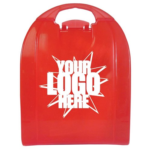 Small all-in-one kit contains 37 items used in first aid. The red case is reusable and refillable. Contents are: 10 plastic bandages 3/4" x 3". 10 plastic bandages 3/8" x 3", 2 gauze pads 2" x 2" (2 per pack), 3 alcohol cleansing wipes, 1 butterfly closure and 10 cotton tipped applicators. Kit can be customized with company logo or slogan, call for quote.