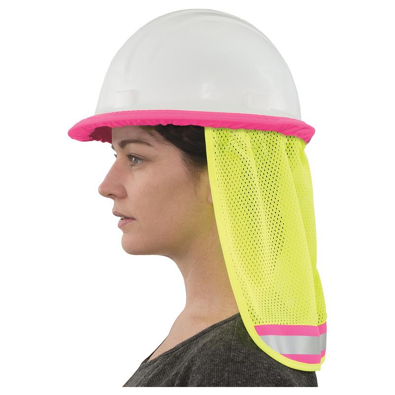Ultra-light weight 100% polyester mesh neck shield, Hi-Viz Lime with Hi-Viz Pink trim. Elastic band fits around brim of all ERB Safety Cap style and Full Brim style helmets. Neck shield provides protection from sun and heat all while increasing wearer visibility.