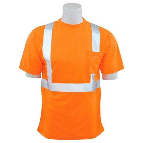 100% polyester birdseye knit mesh Type R, Class 2 t-shirt. X on t-shirt back helps indicate which way wearer is facing. Moisture wicking t-shirt features one left chest pocket, short sleeves and AwareLite reflective tape. Meets ANSI/ISEA 107-2015.