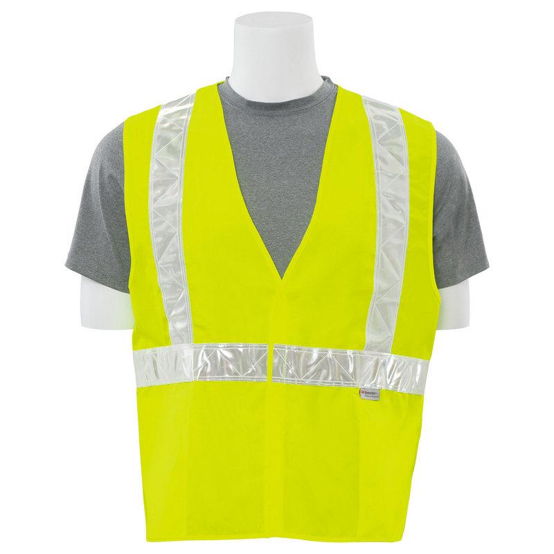 100% solid polyester vest with 3M Scotchlite High Gloss Reflective Material. Three pockets: 1 right lower interior pocket and 1 left lower interior pocket with inset pen compartment. At least one pocket measures large enough to fit a 5.5" cell phone in sturdy case. Hook and loop front closure. Meets ANSI/ISEA 107-2015 Type R, Class 2.