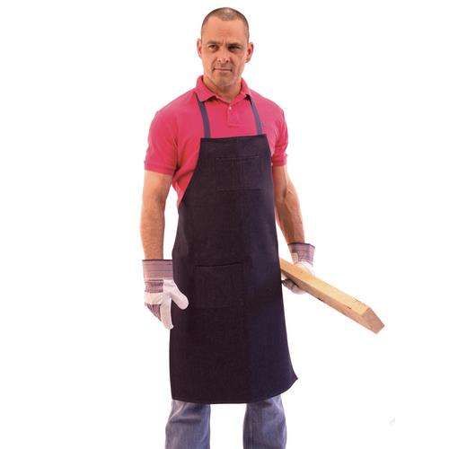 Apron measures: 36" L x 24" W and is made from heavy Duty 10.5 oz. dark indigo denim to mask dirt and stains. Apron features four pockets: 1 4" H divided chest pocket and 1 5.25" H divided waist pocket. Reinforced bartacks at all stress points on apron prevent ties from pulling away.