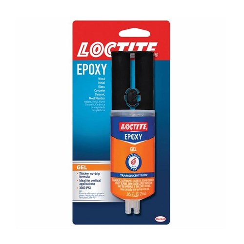 Loctite Epoxy Gel is a two-part adhesive consisting of an epoxy resin and a hardener, available in a convenient dual syringe. When mixed in equal volumes, the resin and hardener react to produce a tough, rigid, high strength bond in 6 minutes. The gel formulation is ideal for vertical surfaces where dripping may occur. It can be used as an adhesive for a wide range of materials or as a versatile filler for gap bonding, surface repairs and laminating. Loctite Epoxy Gel does not shrink and is resistant to water and most common solvents. It can be tinted with earth pigments, cement or sand for color matching. It can be sanded and drilled.