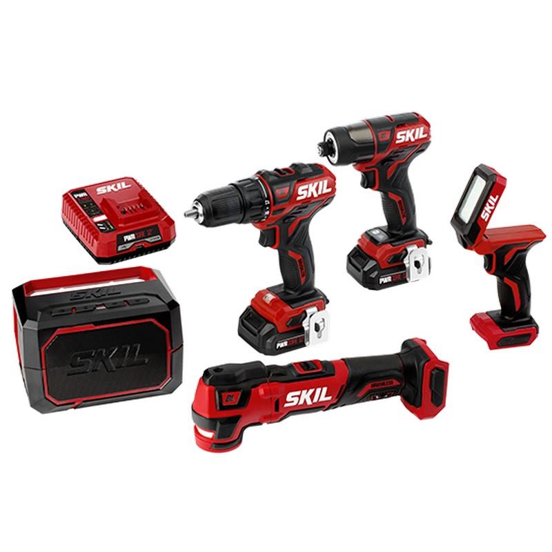 5-Tool Kit From SKIL PWRCORE 12. Get the everyday essentials you need to OWN your home, all in one convenient tool kit to help you cover your DIY to-do list. This kit includes five SKIL PWRCORE 12 products designed for compact power, efficiency and performance: Brushless 12V 1/2 Inch Cordless Drill Driver, Brushless 12V 1/4 Inch Hex Cordless Impact Driver, Brushless 12V Oscillating Multi-Tool, 12V Area Light and 12V Bluetooth Speaker. What's Included: Drill Driver, Impact Driver, Multi-Tool, Light, Speaker, 2pcs 2.0Ah Battery with PWR ASSIST Mobile Charging, PWR JUMP Charger, 2 IN. Bit PH2, Belt Clip, 10pcs sanding paper, 1pc sanding pad, 1pc Bi-metal Plunge Blade, AUX Cable