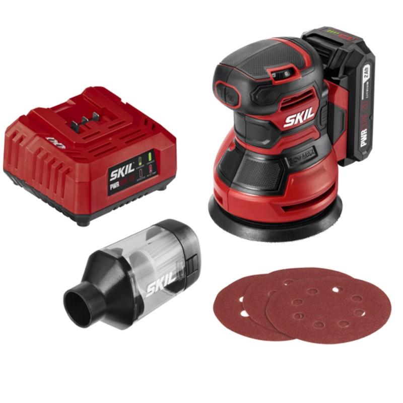Random Orbit Sander from SKIL PWRCORE 20. From refinishing to rehab projects, the high performance SKIL PWRCORE 20 Random Orbital Sander can tackle any project requiring ultra-smooth sanding. This versatile cordless electric sander vibrates and spins simultaneously for a smooth finish. The powerful motor is equipped with Variable Speed Control to maximize efficiency at 7,000-11,000 OPM, while the hook-and-loop pad provides quick and easy change of sandpaper grits. With industry leading PWRCORE 20 lithium battery technology, this tool powers for up to 25% longer run time and 2X battery life of other tools. This orbital sander kit comes with a PWRCORE 20 2.0Ah Lithium-Ion Battery, 1 Hour Charger, 3 PC Sanding Paper, and a Dust Box. What's Included: Random Orbital Sander, 3pcs (1x 60 Grit, 2x120 Grit) sandpaper, Dust Box, 20V 2.0Ah Battery, 20V 1hr Charger