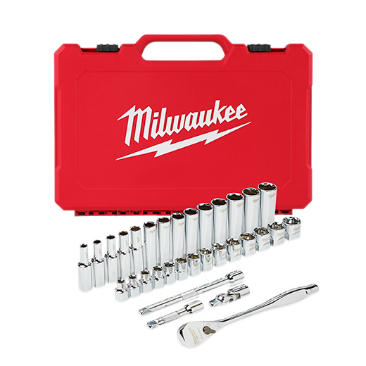 Our MILWAUKEE® SAE 32 piece 3/8" drive Ratchet & Socket set is designed from the ground up, offering our users the Most Versatile Sockets that are Anti-Roll and Wrench-Ready. Its innovative FOUR FLAT™ Sides feature an anti-roll and wrench-ready design. The 90 tooth ratchet tool offers 4° of arc swing and a slim profile design, allowing you to work in tighter and more confined spaces, be it under the hood of a car or in the middle of a remodel. The ratchet and socket kit comes with a removable inner tray which is perfectly designed to be stored long-term in a steel storage chest. All of our sockets are stamped with metric measurements on the flat side for easy-to-read visibility. The set comes with accessories included so that our users can get every job done, both in the garage and on the jobsite. Our ratchet and socket set is backed by our Lifetime Guarantee.