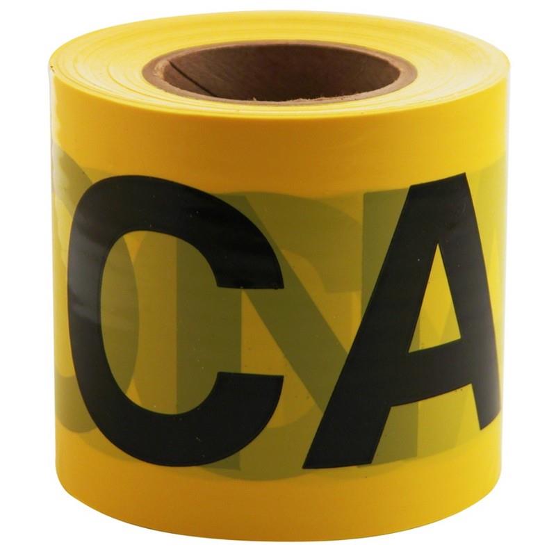 This 300 ft. x 3 in. barricade tape is bright yellow and reads caution in bold black letters, for use in hazardous areas. It is made of a durable plastic and remains pliant in cold weather.