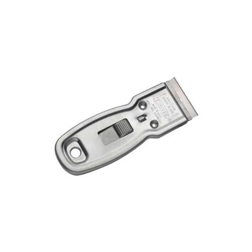 Extra firm clamp holds blade at 5° offset to get under paint. Built-in 1/16" sash guide. Large, ribbed control button. Accepts standard single edge blades.