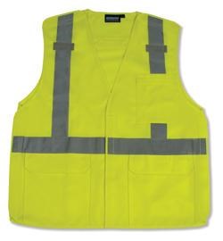 ANSI Class 2 Break-Away. Polyester woven tricot. Fall Protection D-Ring slot on back. Hook & loop front closure. 6 pockets - 2 exterior waist, 1 exterior chest, and 2 pen. Mic tabs. AwareLite reflective trim. Medium - 5XL.