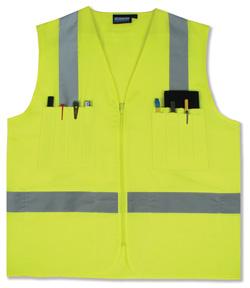 ANSI Class 2 Surveyor's. Polyester woven oxford. Zipper closure. 12 pockets - 2 interior waist, interior waist pen, 4 divisional right chest, double left chest - 1 open and 4 pen. Conforms to ANSI/ISEA 107. Medium - 5XL.